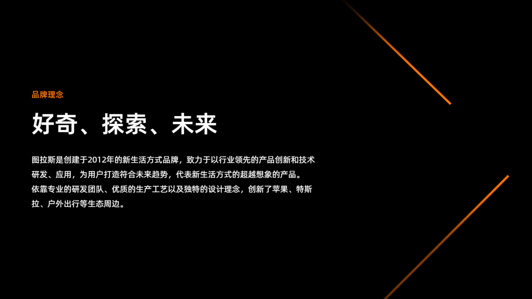 图拉斯是创建于2012年的新生活方式品牌,致力于以行业领先的产品创新和技术研发、应用,为用户打造符合未来趋势,代表新生活方式的超越想象的产品。依靠专业的研发团队、优质的生产工艺以及独特的设计理念,创新了苹果、特斯拉、户外出行等生态周边。